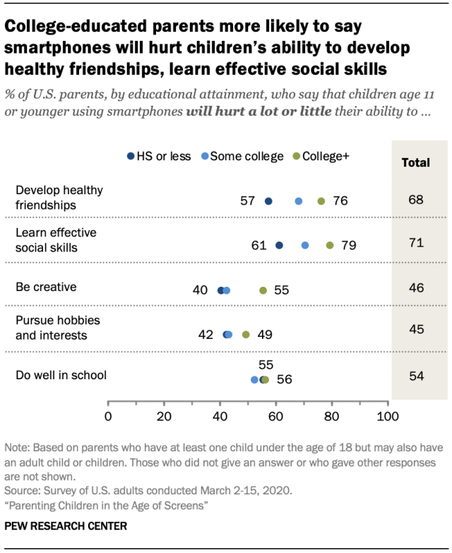 Pew Research CenterJuly 24, 2020 3. Parenting approaches and concerns related to digital devicesCollege-educated parents more likely to say smartphones will hurt children’s ability to develop healthy friendships, learn effective social skills