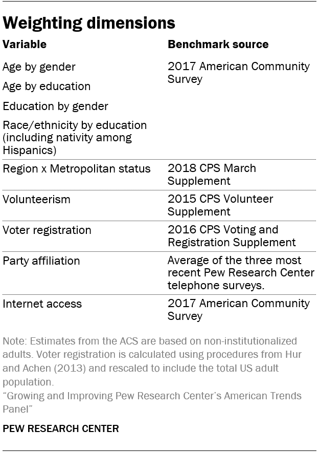 The final step in the weighting uses an iterative technique that aligns the sample to population benchmarks on a variety of characteristics. This stage of weighting, often referred to as “raking,” uses demographic characteristics that are reliably measured by the American Community Survey, including gender, age, education and race. Among Hispanics, the raking adjusts for place of birth (U.S. vs. elsewhere). Researchers have found that this helps correct for the underrepresentation of Hispanics who are immigrants. Two geographic variables used in the raking are U.S. Census region (four categories) and metropolitan status. The weighting also adjusts for internet access, using a measure from the American Community Survey. Party affiliation is also included in the raking to ensure proper representation of adults across the political spectrum. There is no official national parameter for party affiliation. Moreover, because it is an attitude rather than a demographic characteristic, it can change in response to political events. Accordingly, the target for party affiliation in the ATP is based on an average of the three most recent Pew Research Center telephone surveys that asked about party affiliation.