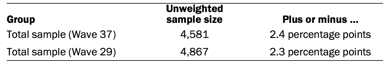Data in this report is primarily drawn from the panel waves conducted Sept. 14-28, 2017 among 4,867 respondents, with a margin of sampling error for the full sample of 2.3 percentage points, and July 30-Aug. 12, 2018 among 4,581 respondents, with a margin of sampling error for the full sample of 2.4 percentage points. All in all, this report references a total of 21 panel waves conducted between November 2015 and August 2018.