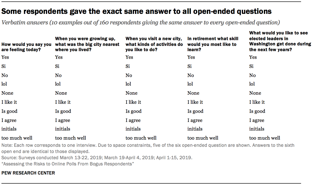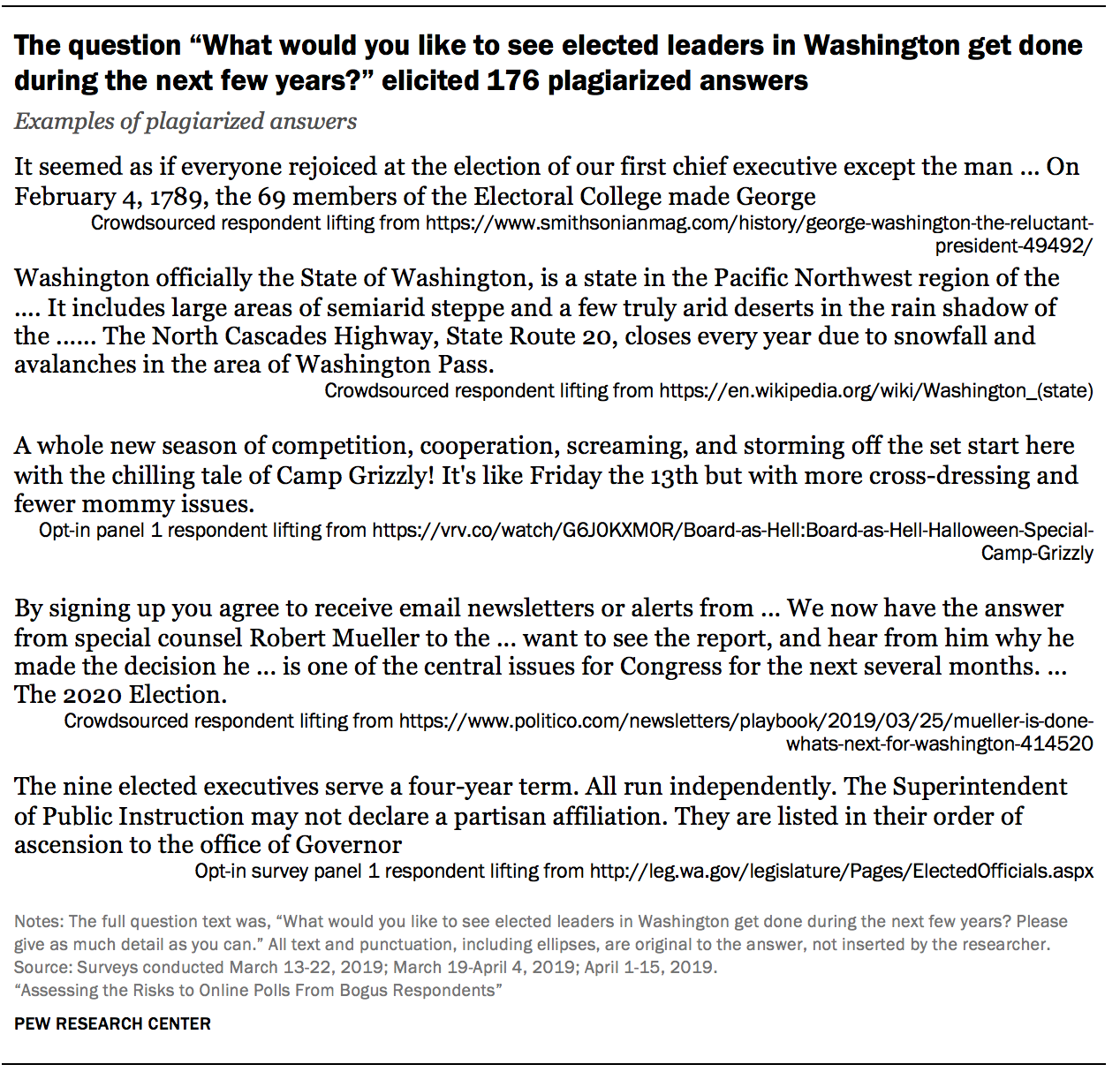 Some of the answers not only made no sense but were clearly lifted from elsewhere on the internet. Often these answers came from websites that are top hits when one enters the survey question into a search engine. For example, a Google search for “What would you like to see elected leaders in Washington get done during the next few years?,” returns a webpage on MountVernon.org, two articles on WashingtonPost.com, and one webpage for the Washington State Legislature. Opt-in respondents gave answers plagiarizing text from all four.