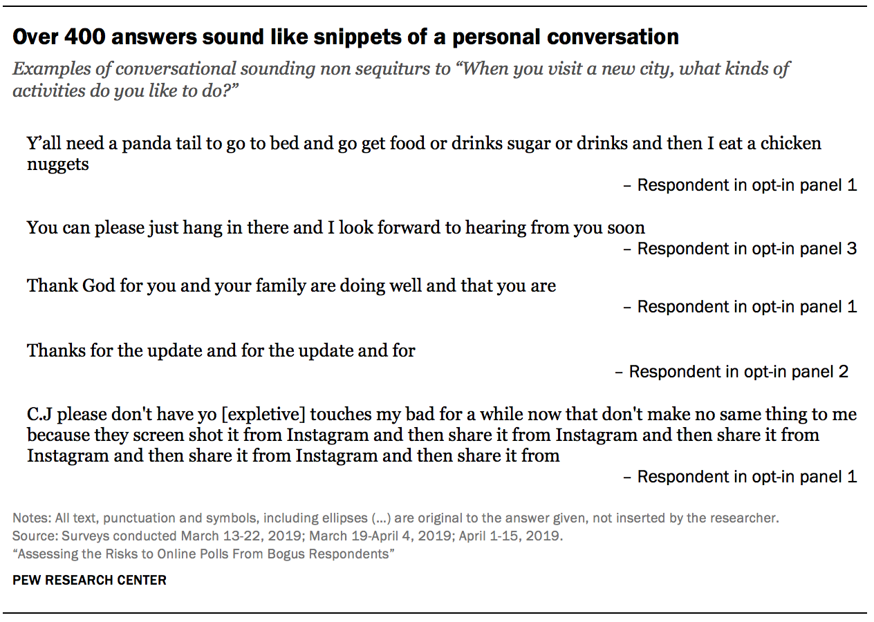 The study also found respondents giving non sequitur answers that sounded like snippets from a personal conversation. For example, when asked what was the big city nearest where they grew up, one respondent said, “Yes we can have dinner at the” and another said, “I love love joe and ahhh so much fun and joe and joe joe.” The repetition of words exhibited by the latter answer is common among these conversational sounding non sequiturs.