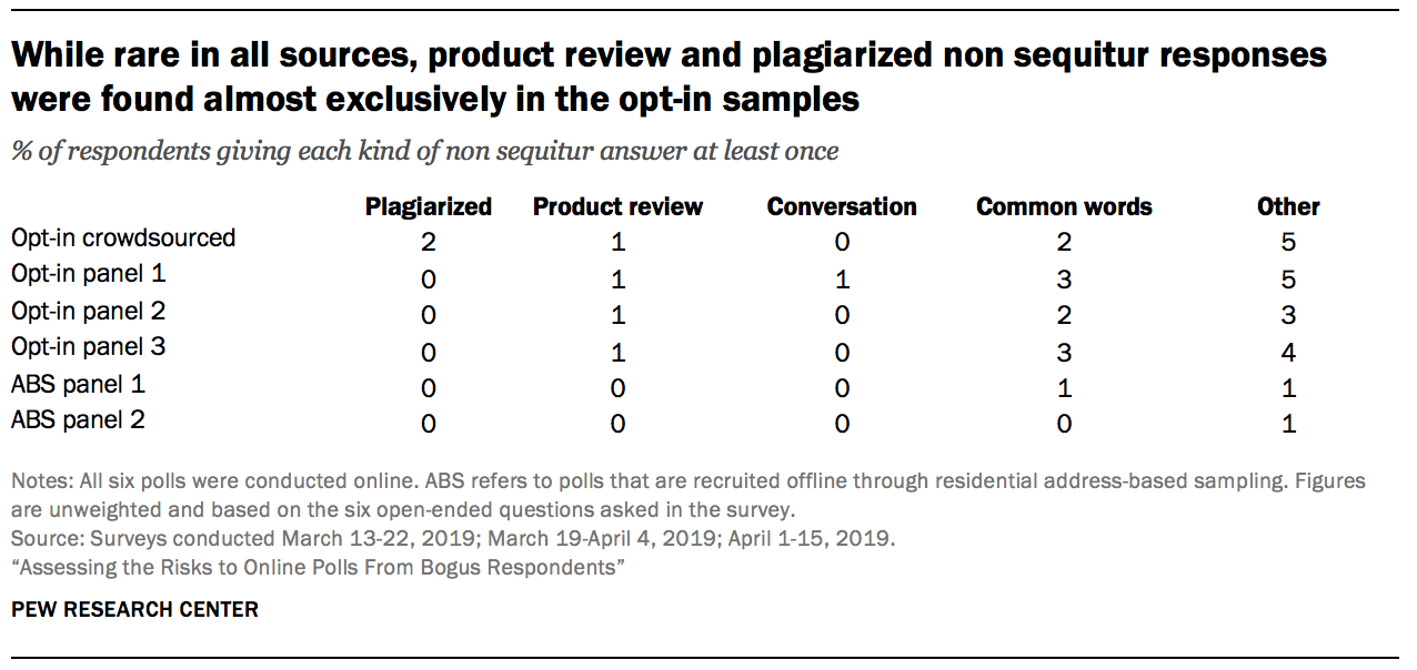 While rare in all the sources tested, product review sounding answers were found almost exclusively in the opt-in samples. Researchers found that 1% of the respondents in the crowdsourced sample and each of the opt-in samples gave a product-review sounding answer to at least one of the open-ends, compared to 0% of the address-recruited respondents.