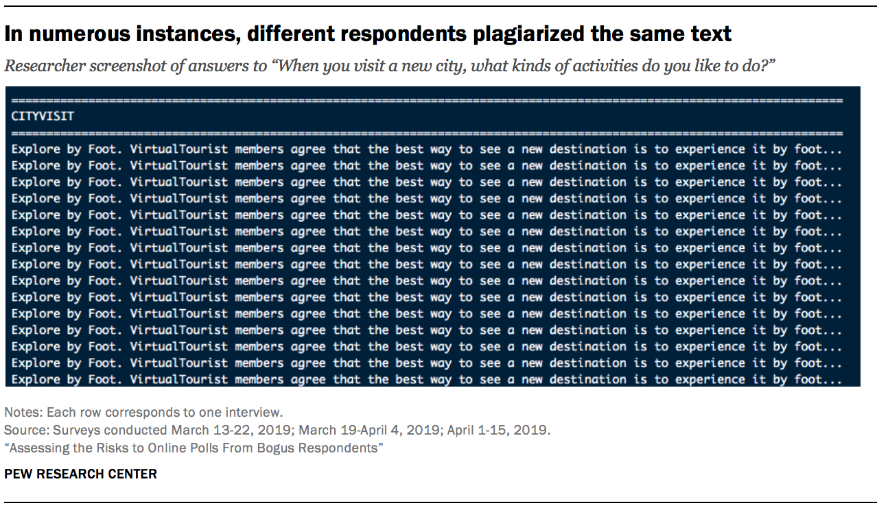 Many plagiarized responses were remarkably similar. Not only did they tend to pull from some of the same websites; they often lifted the exact same text. For example, when asked “When you visit a new city, what kinds of activities do you like to do?,” 15 respondents gave the same passage of text from an article in the travel section stltoday.com.