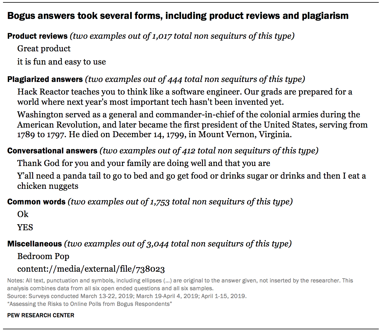 Some non sequitur answers are more suspicious than others. For example, when asked “When you were growing up, what was the big city nearest where you lived?,” some respondents gave geographic answers like “Ohio” or “TN.” But others gave answers such as “ALL SERVICES SOUNDS VERY GOOD” or “content://media/external/file/738023”.12 Answering with a state when the question asked for a city is qualitatively different from answering with text that has absolutely no bearing on the question. This is among the reasons this report focuses on cases that gave multiple non sequiturs, as opposed to just one. Multiple instances of giving answers that do not match the question is a more reliable signal of a bogus interview than a single instance.
