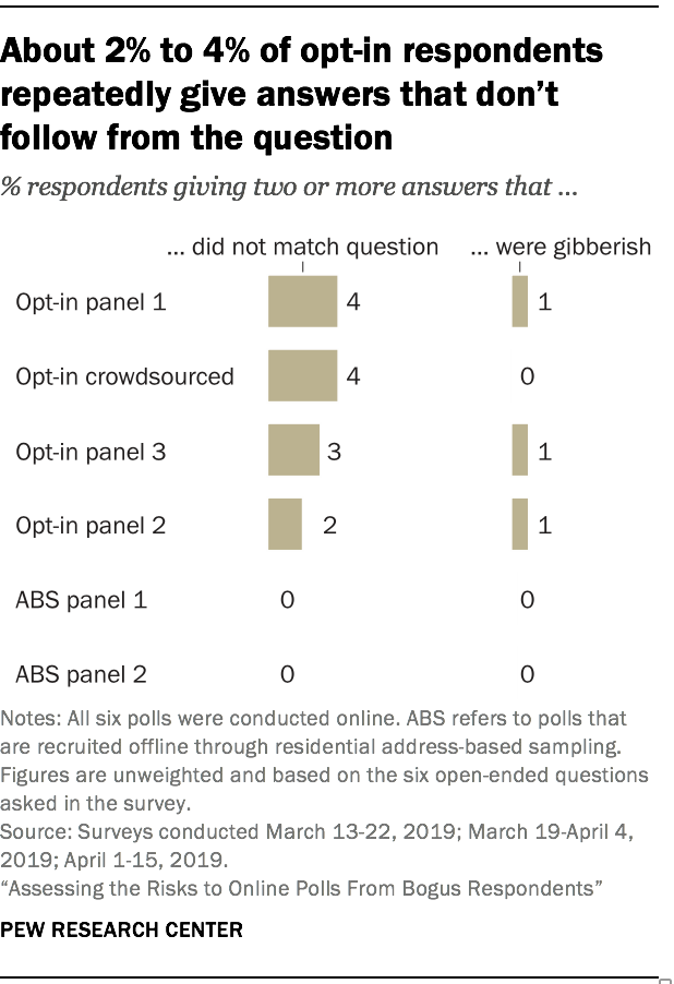 Researchers manually coded each of the 375,834 open-ended answers into one of four categories: responsive to the question; does not match the question; gibberish; or did not answer (respondent left it blank or gave a “don’t know” or refusal type answer).11 In all six sources most respondents appear to be giving genuine answers that are responsive to the question asked. That said, the study found that 2% to 4% of opt-in poll respondents repeatedly gave answers that did not match the question asked. Throughout the report we refer to such answers as non sequiturs. There were a few such respondents in the address-recruited panel samples, but as share of the total their incidence rounds to 0%.