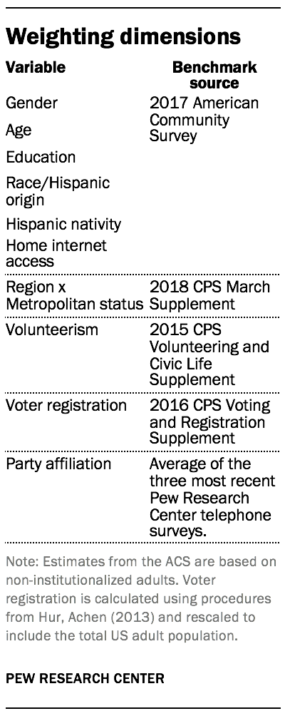 While the report analysis is based on unweighted data, researchers created a weight for each sample to assess whether the main study findings hold up when weights are applied. Each of the six samples was weighted separately. The weighting used an iterative technique called raking to align the sample with population benchmarks for U.S. adults on the dimensions listed in the accompanying table. The same raking dimensions were used for all six samples.