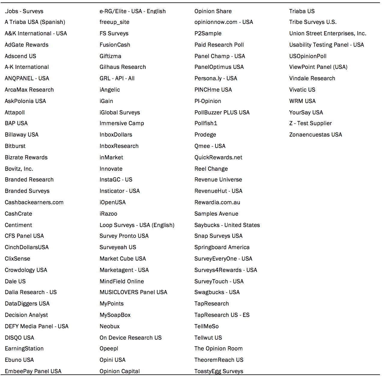 With the address-recruited panels, respondents are recruited by sampling residential addresses from the U.S. Postal Service Computerized Delivery Sequence File, and in years prior, by sampling telephone numbers using random digit dial. With the crowdsourced sample poll, the sample consists of workers on the crowdsourcing site. Two of the three opt-in survey panel vendors used third party companies, listed below (combined and de-deduplicated to avoid panel identification). One of the opt-in survey panel vendors reported using no third party companies.
