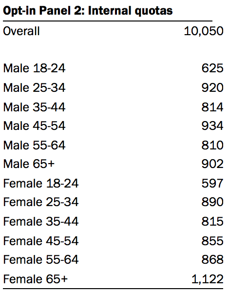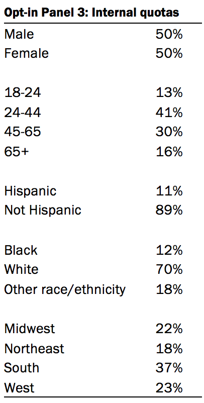The vendor was instructed to use formatting, style, and respondent sourcing that is normal for political polls conducted on each of the panels. In theory, Center researchers could have required a set of elaborate quotas for each opt-in source. That was purposefully avoided because it would have damaged the generalizability of the results. Had we required our own custom set of quotas, the study results would only be generalizable to opt-in surveys sampled the way Pew Research Center would do it. But that was not the study goal. Instead, the inferential goal was to field a national public opinion poll from each source using the specifications used by the panel provider for such polls. While some researchers using opt-in sources do use elaborate quotas, many do not. This study is designed to speak to the quality of data public pollsters received when they rely on the opt-in provider to ensure that the sample is sound.