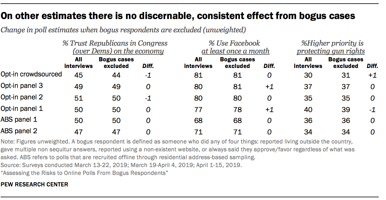 Not all survey estimates, however, are affected by bogus respondents. For example, estimates of the political party people trust more on the economy do not change at all for two of the opt-in panel polls when bogus respondents are dropped. Similarly, there is no change in some of the opt-in estimates for the share saying that protecting the right to own guns is a higher priority than enacting new laws to try to reduce gun violence, when bogus cases are dropped.