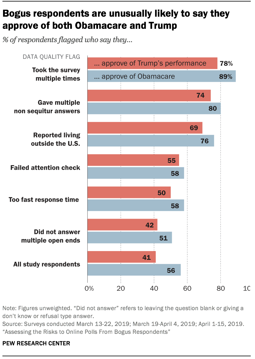 Based on these findings, it is understandable how prior research teams looking at those traditional flags could have concluded that such respondents were not that different and are perhaps best kept in the survey analysis. But the data quality flags highlighted in this study (e.g., taking the survey multiple times, giving non sequitur answers) tell a very different story. Those flags show suspect respondents giving systematically different answers for key questions. Because the answers are systematic (e.g., largely favorable to the 2010 health care law or to Trump), they stand to move topline survey figures rather than merely adding noise.