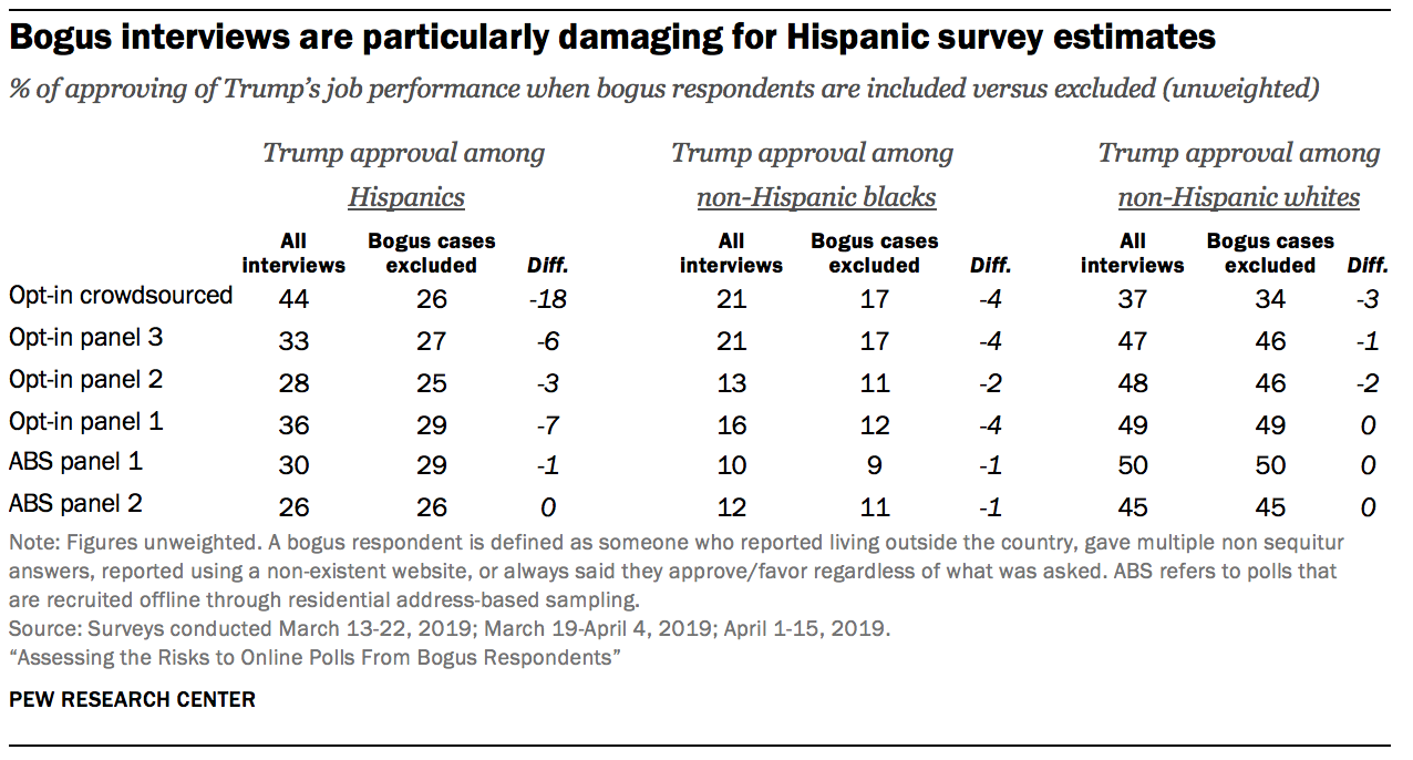 The fact that bogus cases are disproportionately likely to report being Hispanic means that the damage from bogus cases is particularly large for Hispanic estimates. For example, when looking at the opt-in panel polls, Trump’s job approval among non-Hispanic whites changes by one percentage point, on average, when bogus cases are removed. By contrast, his approval rating among Hispanics drops five percentage points on average when bogus cases are removed. The damage to the Hispanic estimate from the crowdsourced sample is far worse – an 18 percentage point change. Among the address-recruited online panel polls, none of the subgroup estimates changed by more than a percentage point.