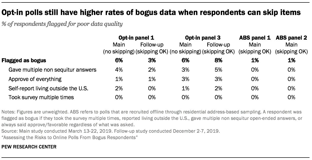 The follow-up study also tested whether allowing opt-in respondents to skip questions would reduce the bogus incidence. Researchers created a flag for bogus cases in the follow-up study using the same definition as the main study. In one opt-in panel, the bogus rate was higher when respondents could skip, while in the other panel it was lower. For opt-in panel 3, the incidence of bogus cases was 6% in the main study that prohibited skipping for opt-in respondents, and it was 8% in the follow-up study that allowed respondents to skip. For opt-in panel 1, the incidence of bogus cases was 6% in the main study that prohibited skipping for opt-in respondents, and it was 3% in the follow-up study that allowed respondents to skip. In neither case was the rate of bogus respondents as low as it was for the address-recruited panels (1%).
