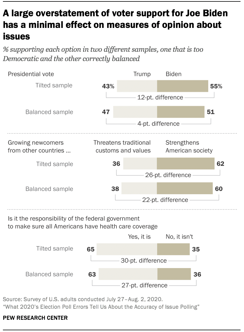 Pew Research Center conducted this study to understand how errors in correctly representing the level of support for Joe Biden and Donald Trump in preelection polling could affect the accuracy of questions in those same polls (or other polls) that measure public opinion on issues. Specifically, if polls about issues are underrepresenting the Republican base the way that many 2020 preelection polls appeared to, how inaccurate would they be on measures of public opinion about issues? We investigated by taking a set of surveys that measured a wide range of issue attitudes and using a statistical procedure known as weighting to have them mirror two different scenarios. One scenario mirrored the true election outcome among voters (a 4.4-point Biden advantage, and another substantially overstated Biden’s advantage (a 12-point lead). For this analysis, we used several surveys conducted in 2020 with more than 10,000 members of Pew Research Center’s American Trends Panel (ATP), an online survey panel that is recruited through national, random sampling of residential addresses that ensures that nearly all U.S. adults have a chance of selection. Questions in these surveys measured opinions on issues such as health care, the proper scope of government, immigration, race, and the nation’s response to the coronavirus pandemic. These opinions were examined to see how they differed between the two scenarios.