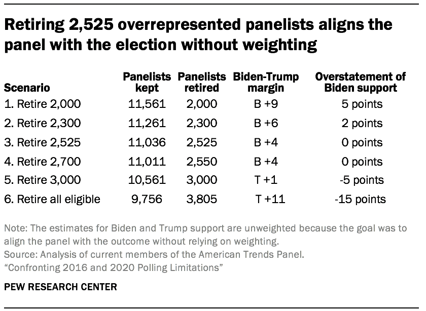Researchers simulated subsampling varying fractions of those eligible for retirement. For each simulation, researchers computed the unweighted 2020 vote using post-election survey respondents who would not be retired under the simulation. The simulations are unweighted because the goal is to stop relying on weighting to fix these biases. The analysis indicated that retiring about 2,500 of the eligible panelists (scenario 3) would align the panel to the 2020 vote outcome of Biden receiving 51% of the vote and Trump receiving 47%. This is the scenario being implemented this year.