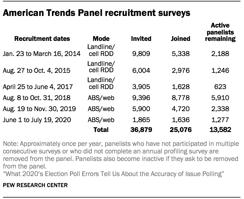 In August 2018, the ATP switched from telephone to address-based recruitment. Invitations were sent to a random, address-based sample of households selected from the U.S. Postal Service’s Delivery Sequence File. Two additional recruitments were conducted using the same method in 2019 and 2020, respectively. Across these three address-based recruitments, a total of 17,161 adults were invited to join the ATP, of whom 15,134 (88%) agreed to join the panel and completed an initial profile survey. In each household, the adult with the next birthday was asked to go online to complete a survey, at the end of which they were invited to join the panel. Of the 25,076 individuals who have ever joined the ATP, 13,582 remained active panelists and continued to receive survey invitations at the time the most recent panel survey used in this report was conducted.