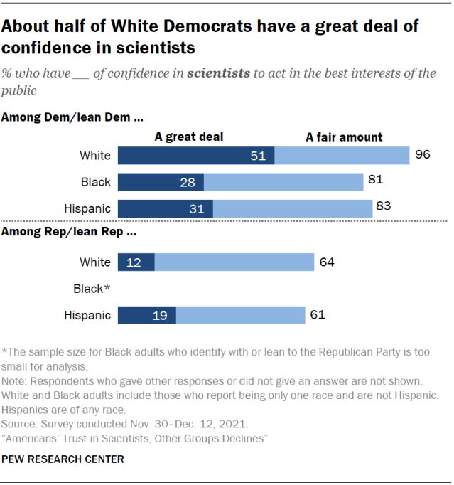 Confidence in scientists is down among White, Black and Hispanic adults since earlier in pandemic