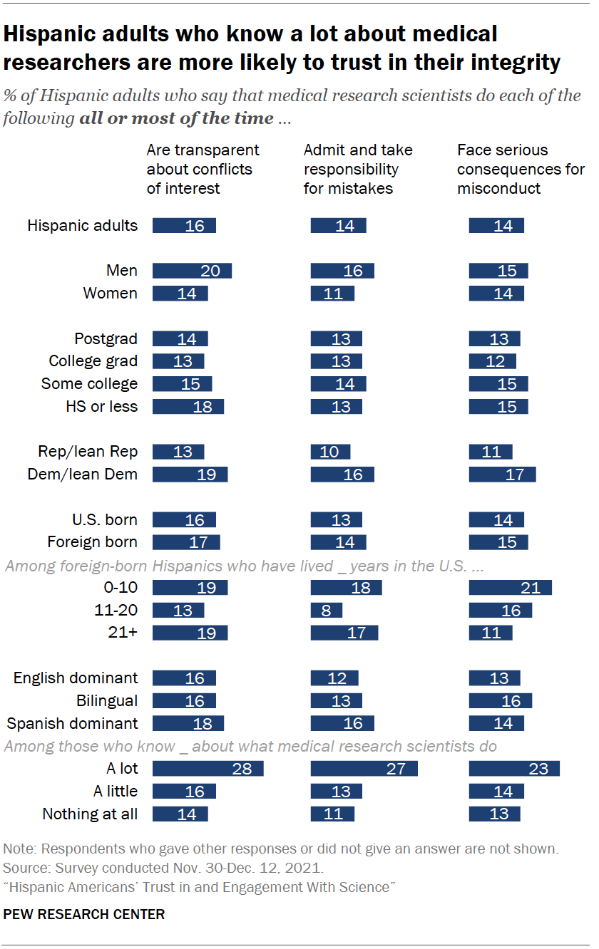 Pew Research CenterJune 13, 2022 Appendix: Detailed charts and tablesHispanic adults who know a lot about medical researchers are more likely to trust in their integrity