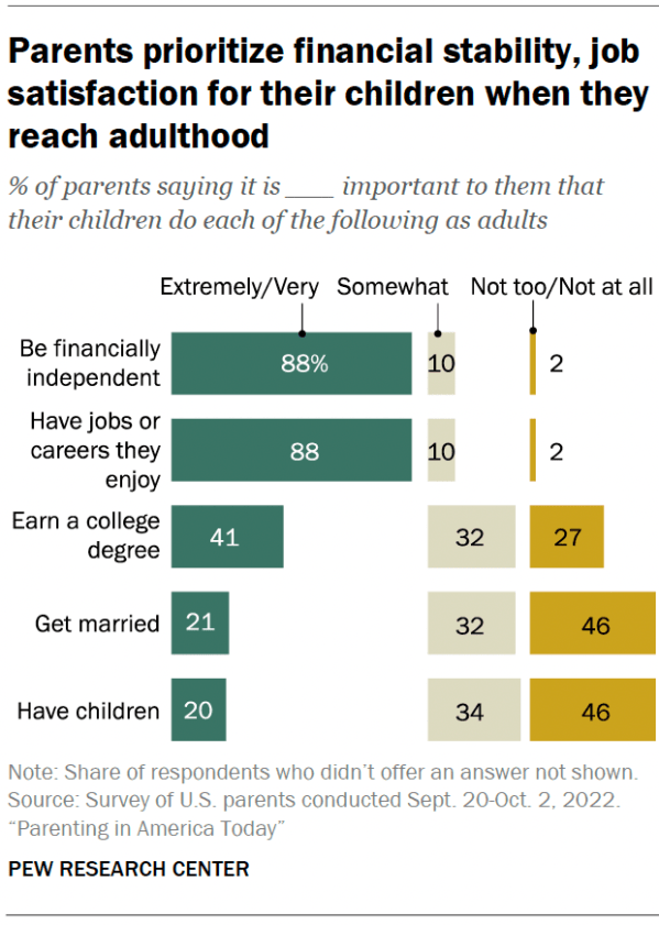 Pew Research CenterJanuary 18, 2023 Parenting in America TodayParents prioritize financial stability, job satisfaction for their children when they reach adulthood