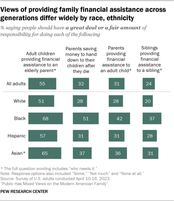 Pew Research CenterSeptember 13, 2023 4. Family responsibilitiesViews of providing family financial assistance across generations differ widely by race, ethnicity